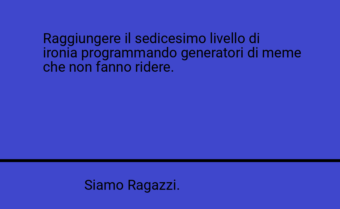 echo "Raggiungere il sedicesimo livello di ironia programmando generatori di meme che non fanno ridere." | siamo-ragazzi -k "male" -o "media/example.png" -s "deterministico"